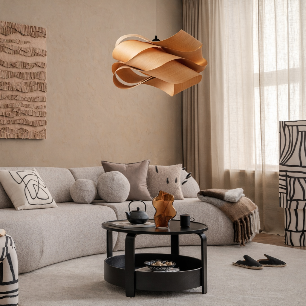 This beautiful lamp brings the elegance of nature directly into your home. With its unique, undulating design made of real wood, the lamp creates a harmonious balance between modernity and organic aesthetics. The flowing shapes allow the light to dance gently between the twisted layers, creating a warm and inviting atmosphere in any room.