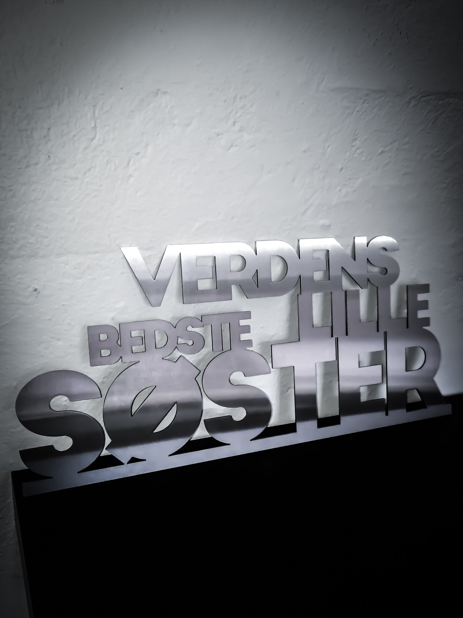 Pynteskilt med teksten "Verdens bedste lillesøster" - udskåret i 2 mm børstet rustfri stål.