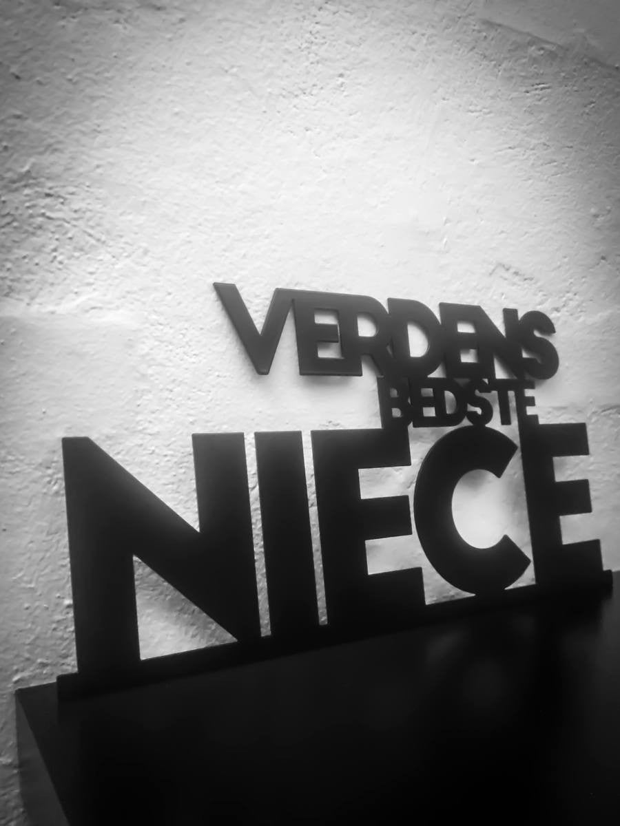 Pynteskilt med teksten "Verdens bedste niece" - udskåret i 2 mm stål og sortlakeret.