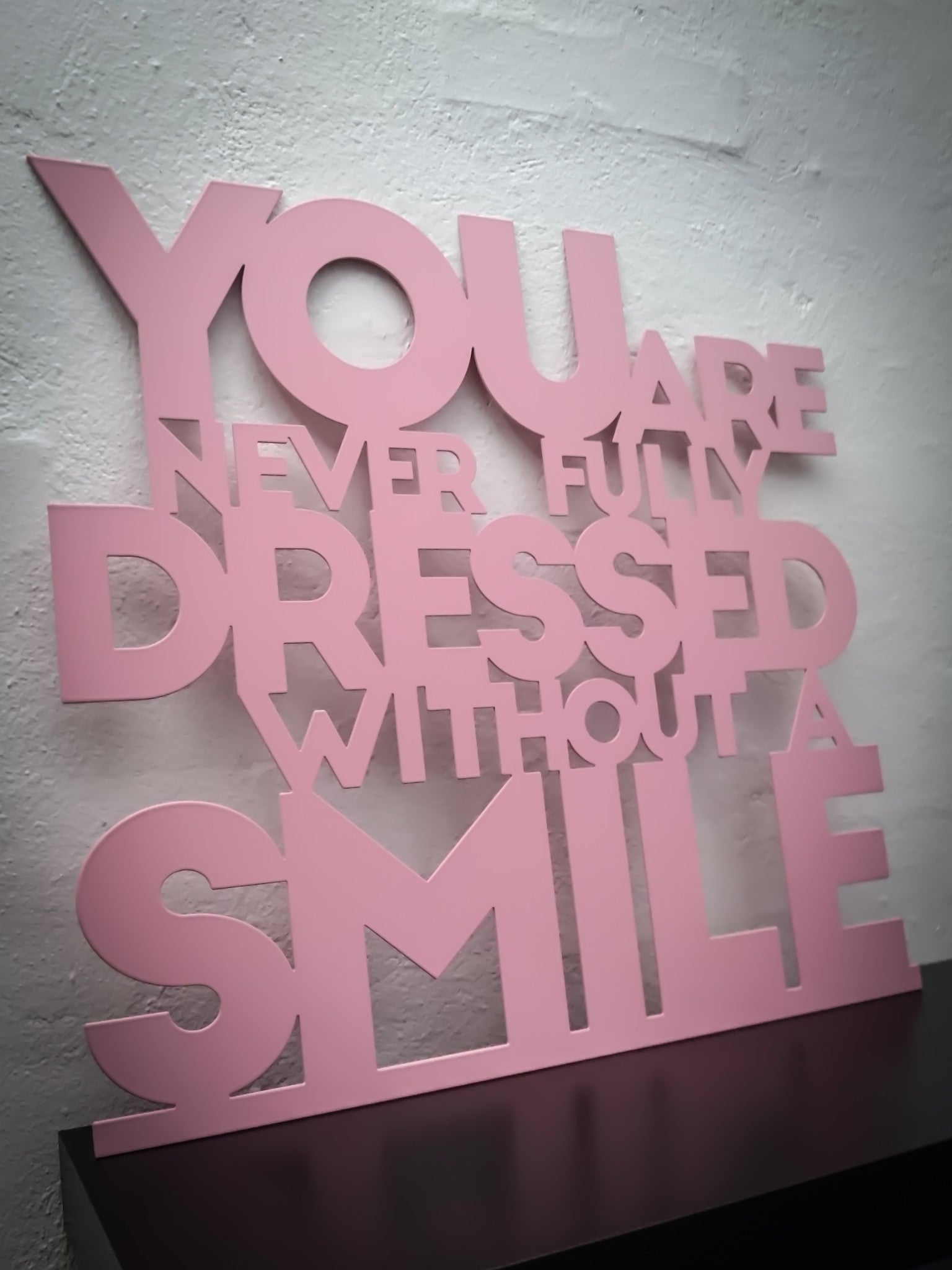 Pynteskilt med teksten "You are never fully dressed without a smile" - udskåret i 2 mm stål og pinklakeret.
